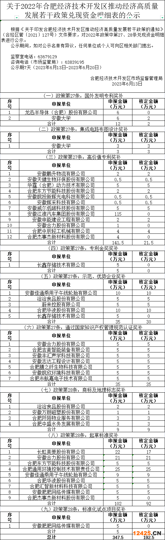 根據(jù)《關(guān)于印發(fā)合肥經(jīng)濟(jì)技術(shù)開(kāi)發(fā)區(qū)推動(dòng)經(jīng)濟(jì)高質(zhì)量發(fā)展若干政策的通知》(合經(jīng)區(qū)管〔2021〕127號(hào))文件要求,對(duì)2022年政策中第27、28條兌現(xiàn)資金明細(xì)表(詳見(jiàn)附件)進(jìn)行公示。