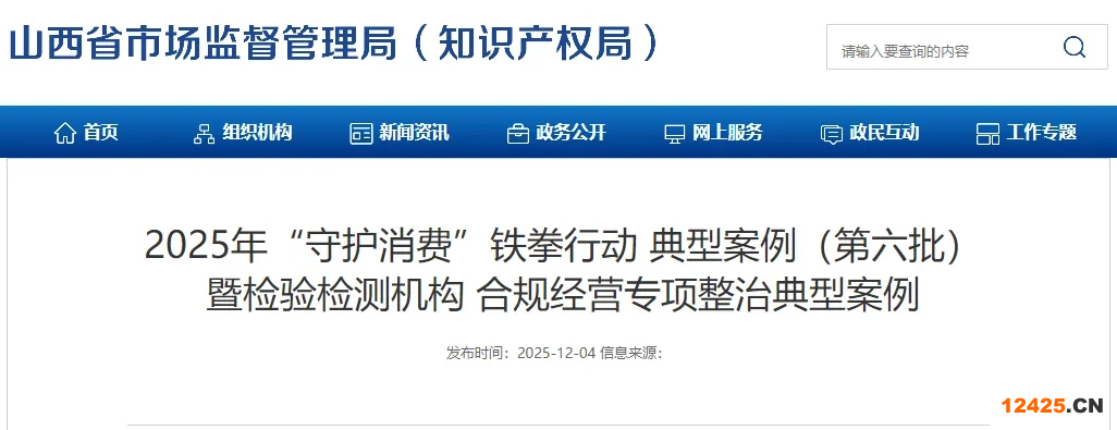 近日,山西省市場監管局發布2025年“守護消費”鐵拳行動典型案例(第六批)暨檢驗檢測機構合規經營專項整治典型案例。