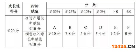 用凈資產增長率和銷售收入增長率分別對照下表指標評價檔次(ABCDEF)評出分數比例,用分數比例乘以賦值計算出每項得分,兩項得分相加計算出凈資產和銷售額成長性指標實際得分。