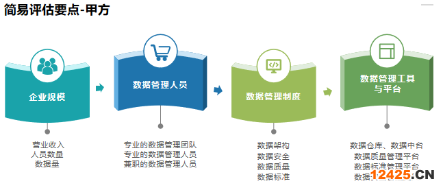 DCMM評估包含的內容也較多,且向下兼容,所以申請高等級評估同時需要滿足低等級的要求。簡易評估要點主要包含企業規模、數據管理人員、數據管理制度和數據管理工具與平臺等維度: